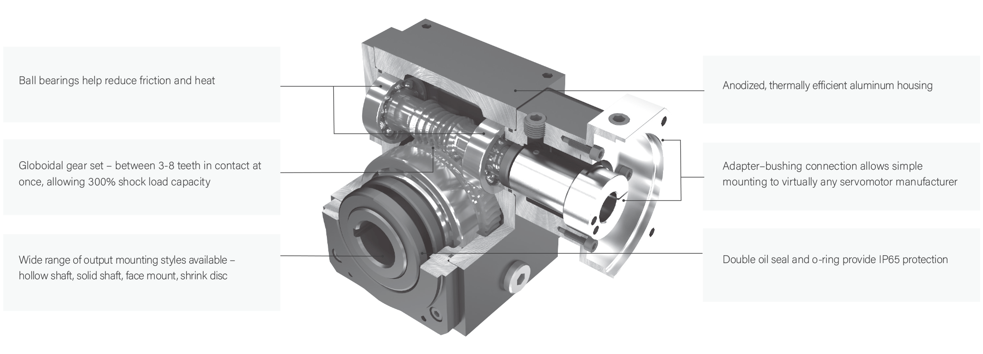 Our internal design captures both sides of the gear tooth to completely eliminate backlash and guarantee it for the life of the product. Exact reduction ratios allow for simplified servo tuning. Ratios 5:1 through 60:1 are available in a single stage, resulting in a more compact design. The face mounting option gives customers the ability to directly attach components such as tables, pinion gears and timing belt pulleys, eliminating the need for couplings.
