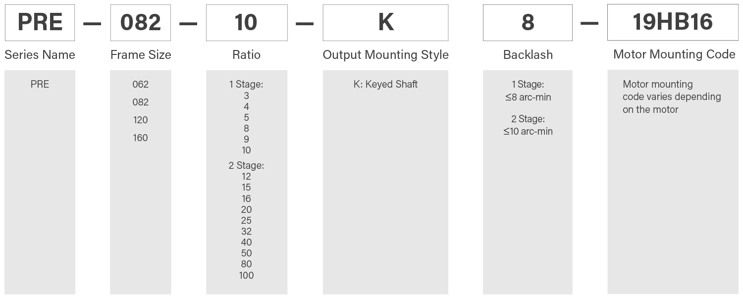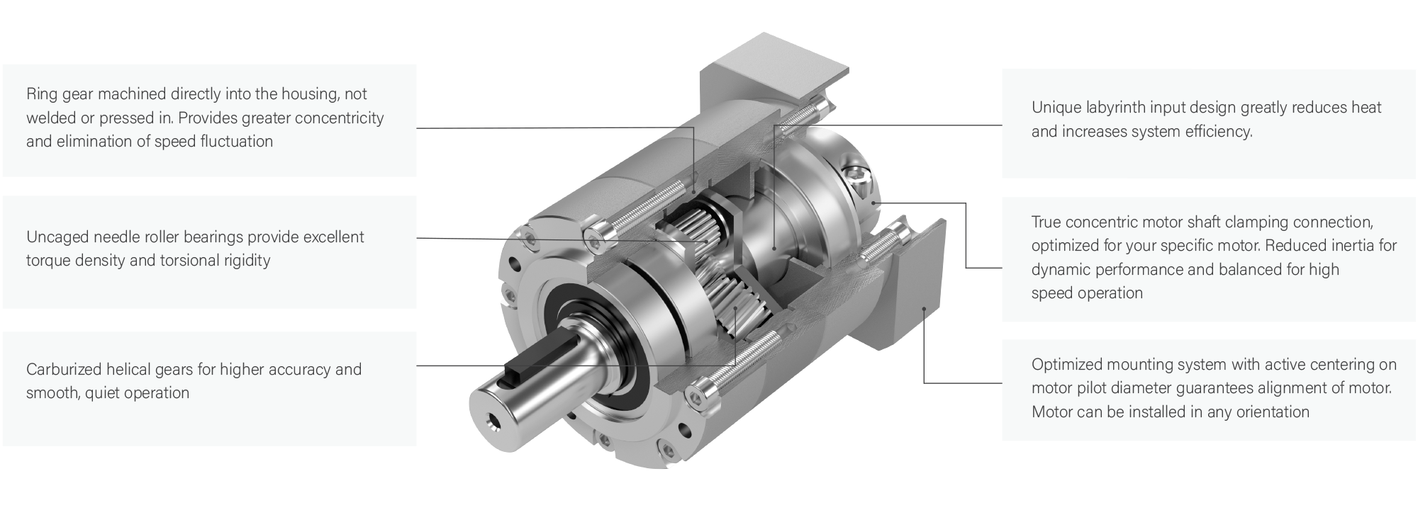 The PRE features industry-standard output mounting geometry with simple adaptation to any motor. Frame sizes from 062-160, along with ≤ 8-10 arc-minute backlash, allow the PRE to cover a broad range of application requirements where cost is a key consideration. As with all Nidec DTC planetary products, PRE is designed for maximum heat reduction and running efficiency through the use of special sealing and lubrication technology.