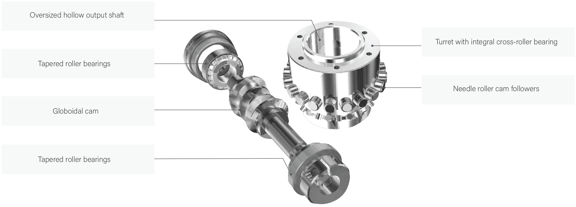 This versatile solution features programmable output motions with low-wear rolling contact. Larger inertia load transmission is achieved with internal cam ratio reduction while maintaining powerful torque with less motor horsepower. The STR’s unique no-backlash preloaded mechanism improves the overall dynamics to force output motions to a new level of rigidity and accurate servo controller performance. The compact design reduces footprint while offering high speed rotation with large bending moment capacity.