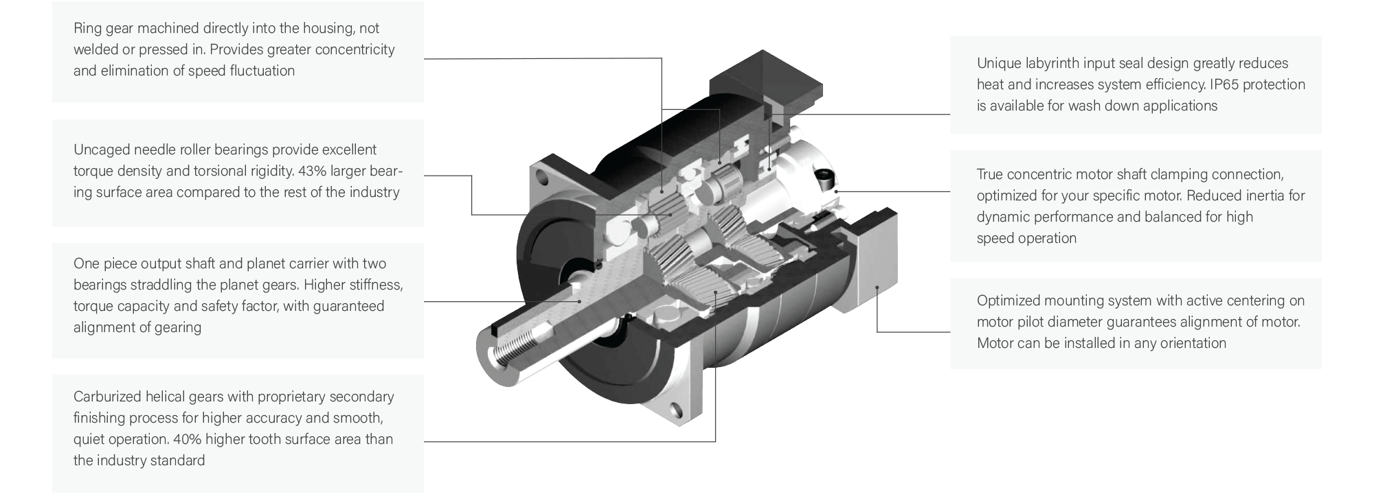 A valuable alternative for applications requiring high positional accuracy and dynamic performance. The VRB is a <3 arc-min gearbox that offers a through hole mounting design, making it easier to assemble onto various equipment. This product is an ideal fit for various belt drive and actuator applications found throughout the packaging and assembly cell automation markets.