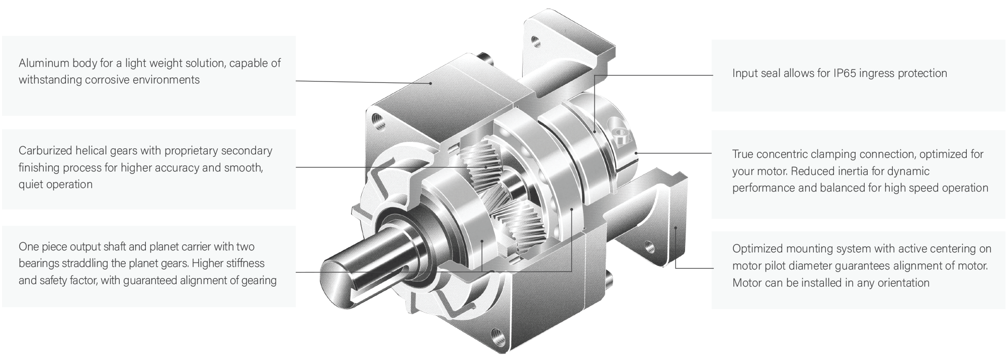 The intelligent, value engineered selection for lower duty cycle servo and stepper motor applications. The VRSF utilizes a lightweight aluminum frame, making it optimal for traveling axes and end of arm tooling systems. Helical cut gearing allows the VRSF to operate much quieter than the industry standard economy products which rely on spur gearing. The VRSF comes standard with 15 arc-minutes of backlash, but can also be configured to higher accuracy levels.