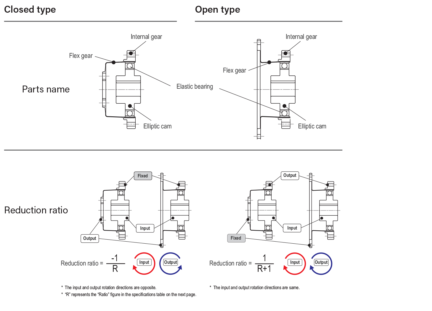 With internal gear fixed and cam (input) rotated clockwise, the flex gear (output) rotates counter clockwise. Direction and speed of rotation is determined by tooth count of gears and mounting geometry.