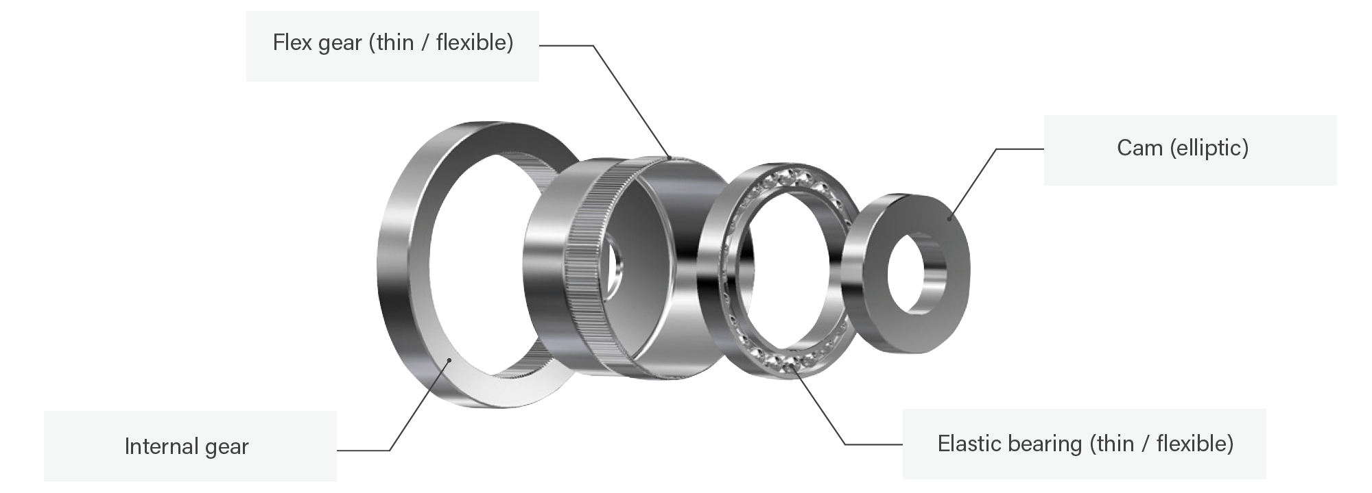 Flex gear and elastic bearing take elliptic shape with cam inserted.