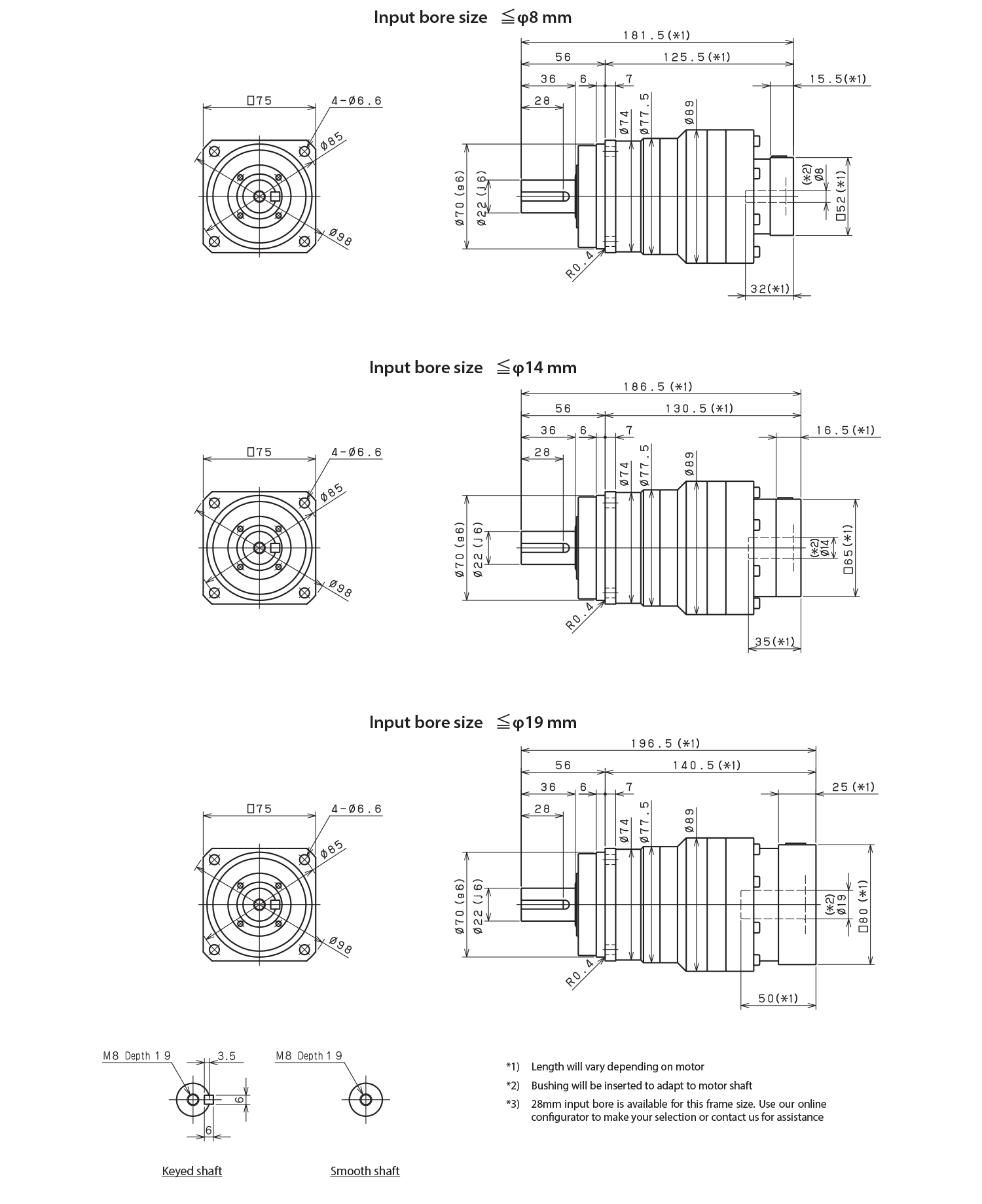 Our motor mounting codes can be configured automatically using our online selection tool. These tables supply the details behind these codes. The tables start with Input Bore measurement and the Part # Code, which are indicated at the end of every model code.