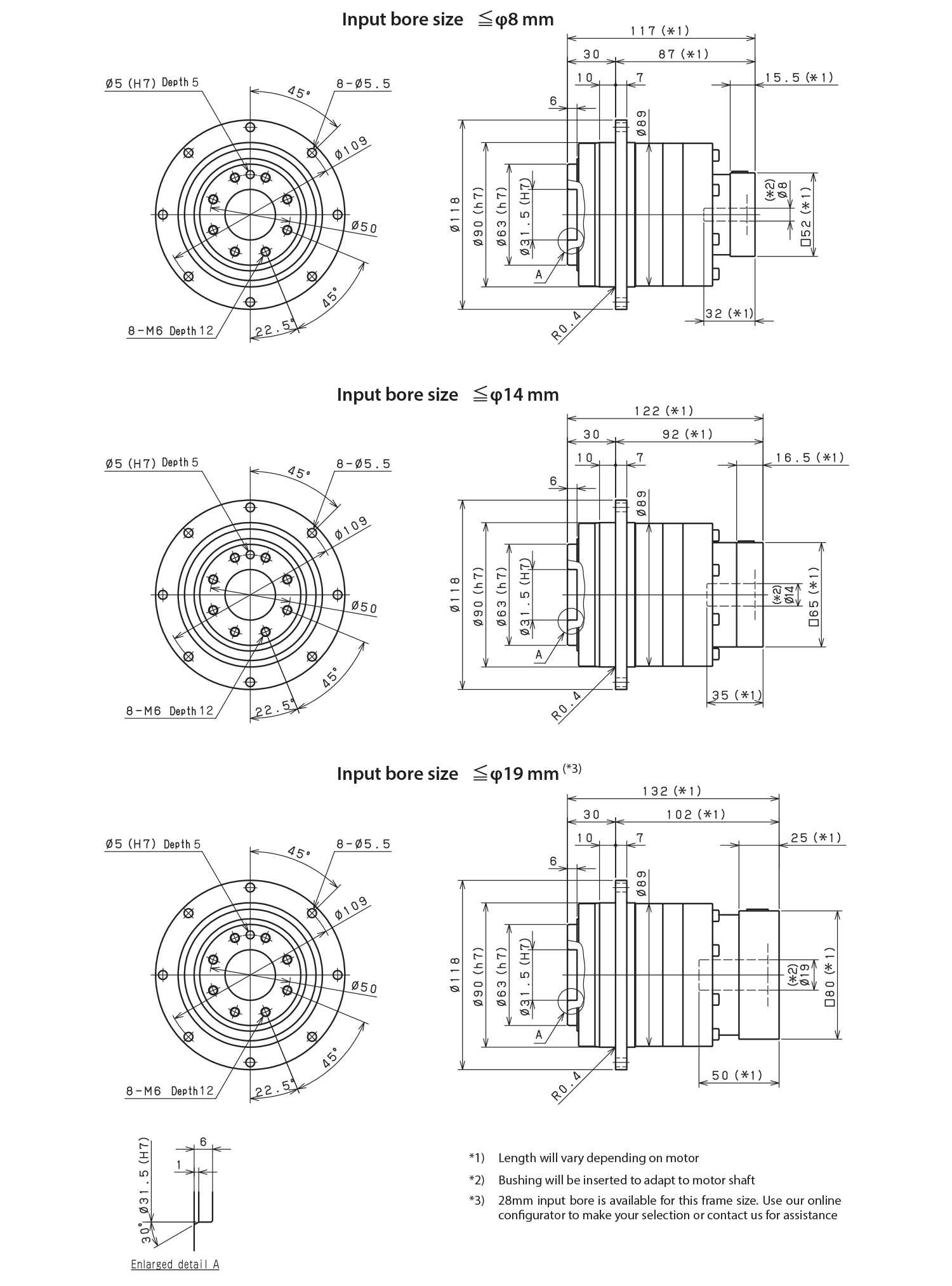 Our motor mounting codes can be configured automatically using our online selection tool. These tables supply the details behind these codes. The tables start with Input Bore measurement and the Part # Code, which are indicated at the end of every model code.