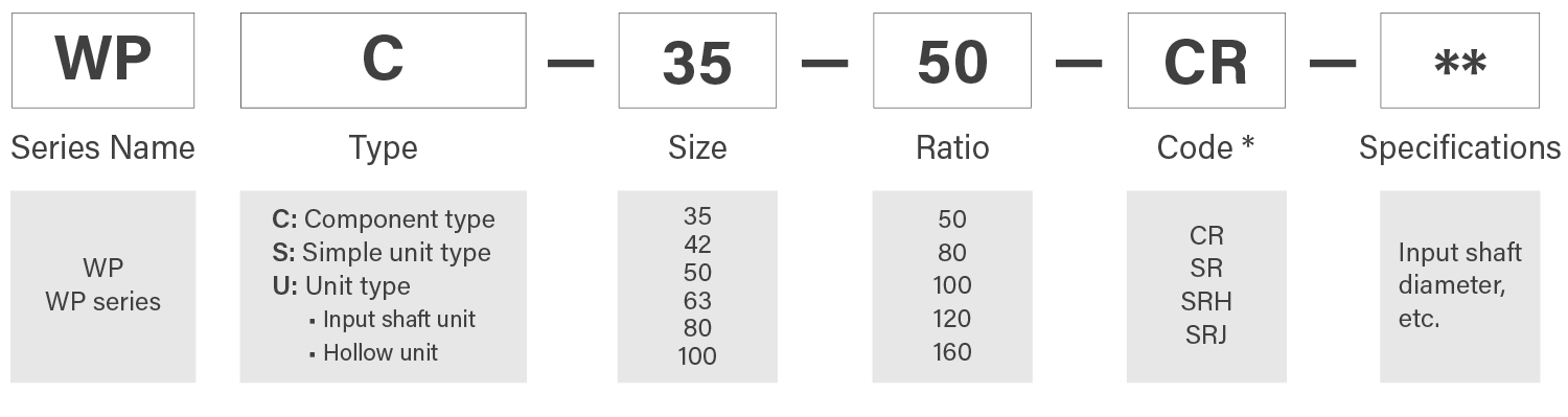 | Frame Size | Ratio R*1 | Nominal Output Torque *2 [Nm] | Maximum Output Torque *3 [Nm] | Emergency Stop Torque *4 [Nm] | Nominal Input Speed *5 [r/min) | Maximum Input Speed *6 [r/min) | Life *7 [hours] |