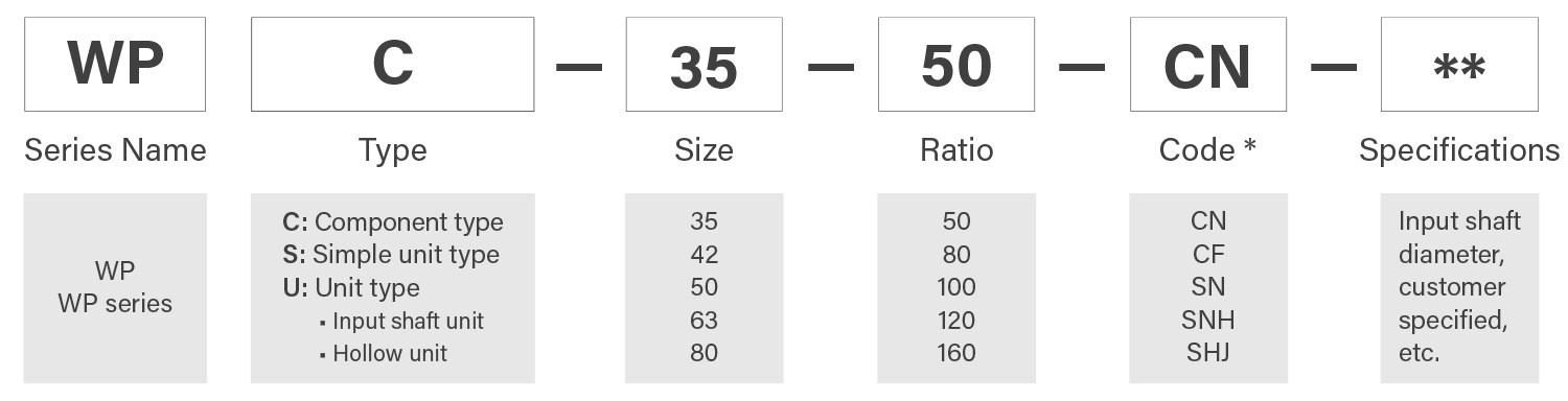 | Frame Size | Ratio R*1 | Nominal Output Torque *2 [Nm] | Maximum Output Torque *3 [Nm] | Emergency Stop Torque *4 [Nm] | Nominal Input Speed *5 [r/min) | Maximum Input Speed *6 [r/min) | Life *7 [hours] |